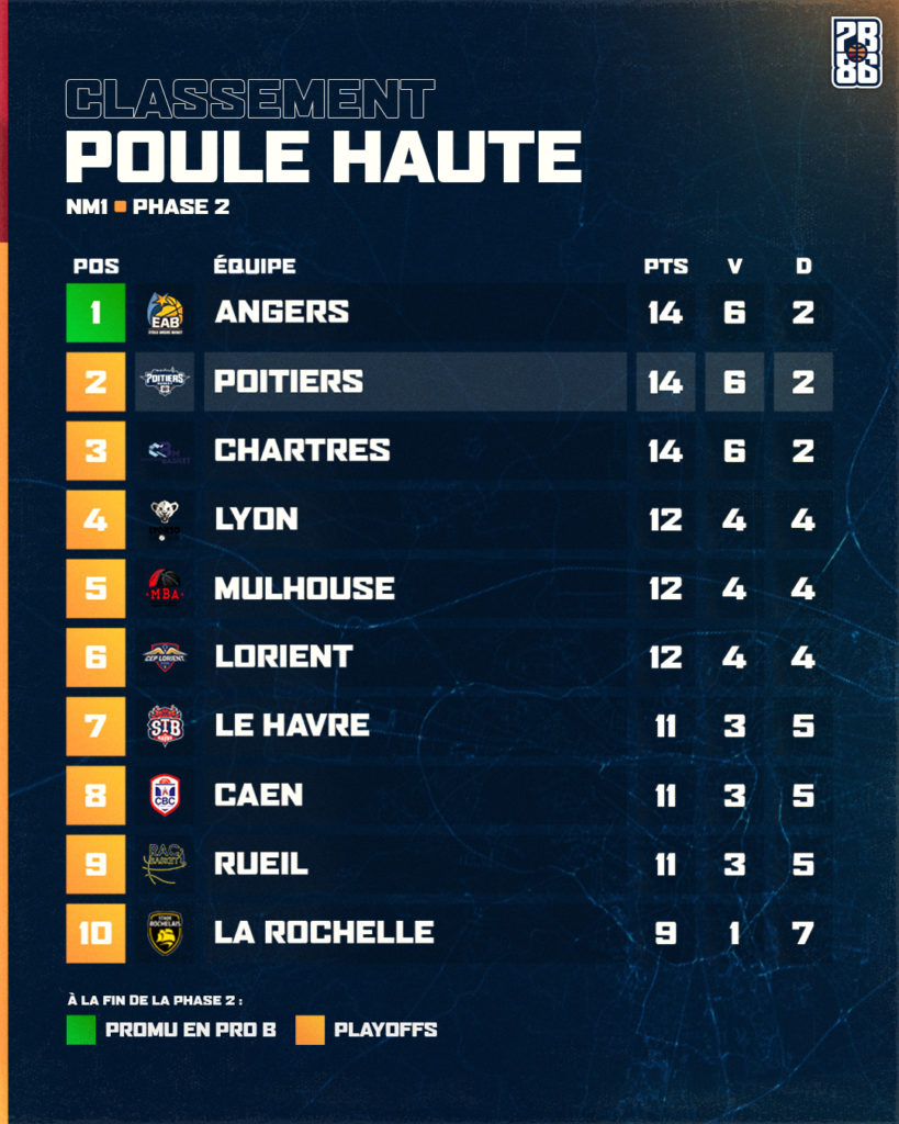 Actuellement à égalité de points avec Angers et Chartres (6 victoires, 2 défaites), en accueillant ce dernier Poitiers Basket entre tout de suite dans le vif du sujet. Le vainqueur pourra aborder la suite avec un surcroît de confiance. Le prochain match de Poitiers aura lieu quatre jours plus tard, à Mulhouse, le même soir, Chartres accueillera Lorient.