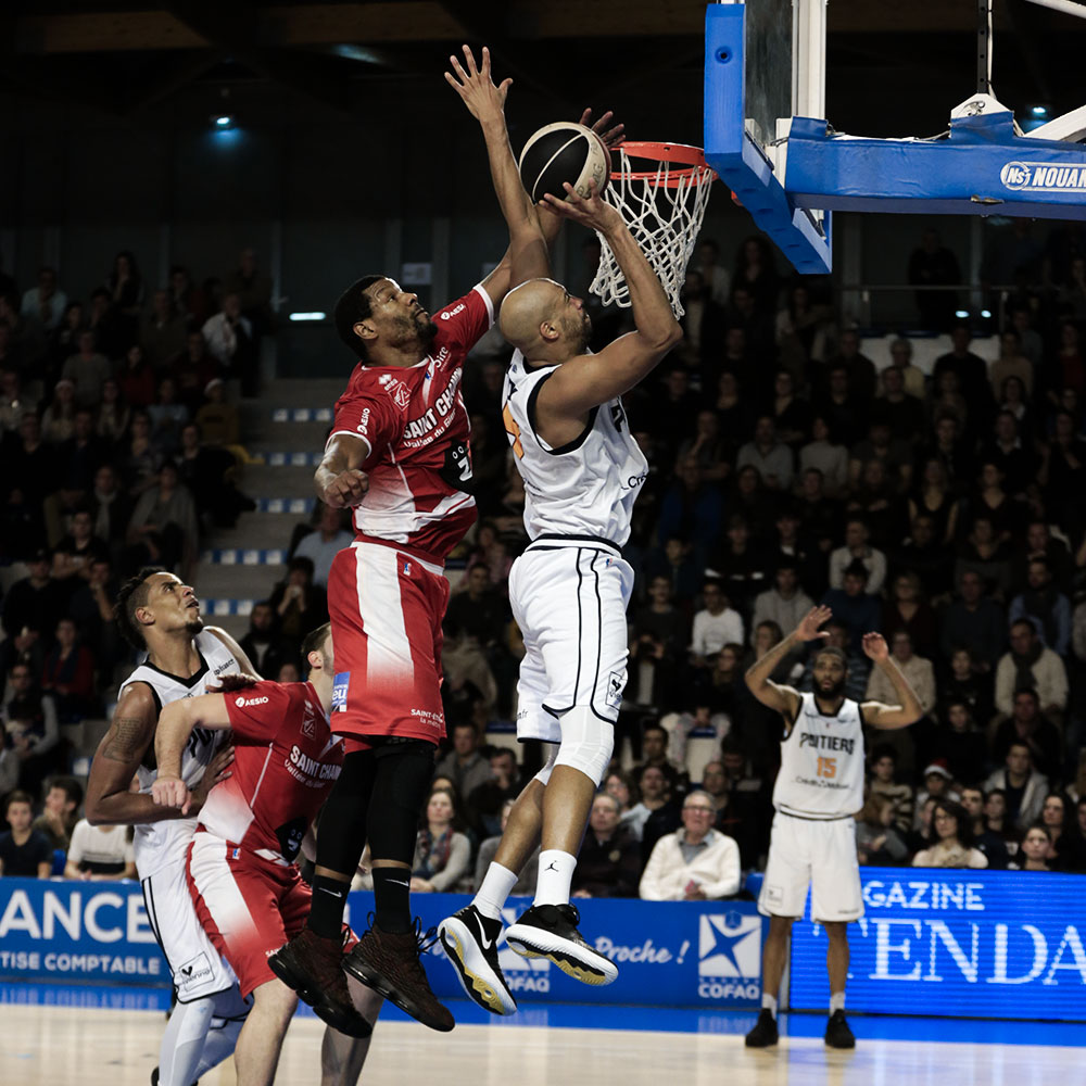 À la mi-temps : « Au début, très en réussite à 3 points, les visiteurs se détachèrent (14-25). Or dans le deuxième quart-temps, les remplaçants poitevins parvinrent à renverser le cours du match (40-31) ».